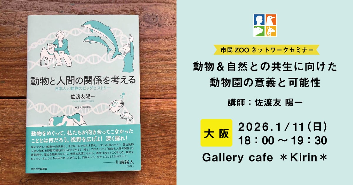 『動物と人間の関係を考える』(東京大学出版会)を出版した佐渡友陽一(市民ZOOネットワーク)から、人間の限界を踏まえて動物&自然との共生に向き合う視点から、動物園の意義と可能性について話題提供させていただきます。